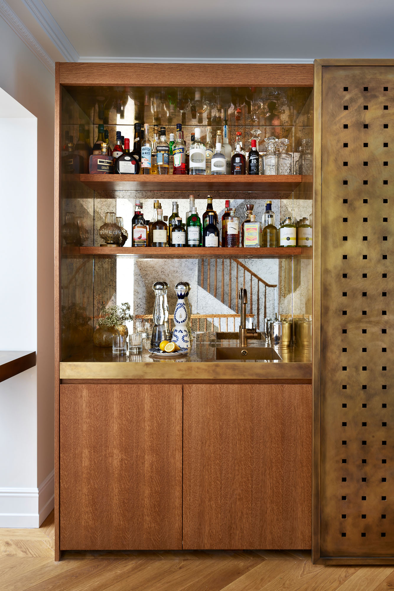 In the sitting room, a bespoke three-seater sofa in George Spencer fabric pairs with a mohair velvet “croissant” shaped sofa, while a custom linen canvas, embroidered with seventeen types of weave, artfully conceals the television. A bespoke statement brass framed drinks cabinet with concealed fridge, sink and ‘hidden cloakroom’ provides a seamless connection to the dining room.