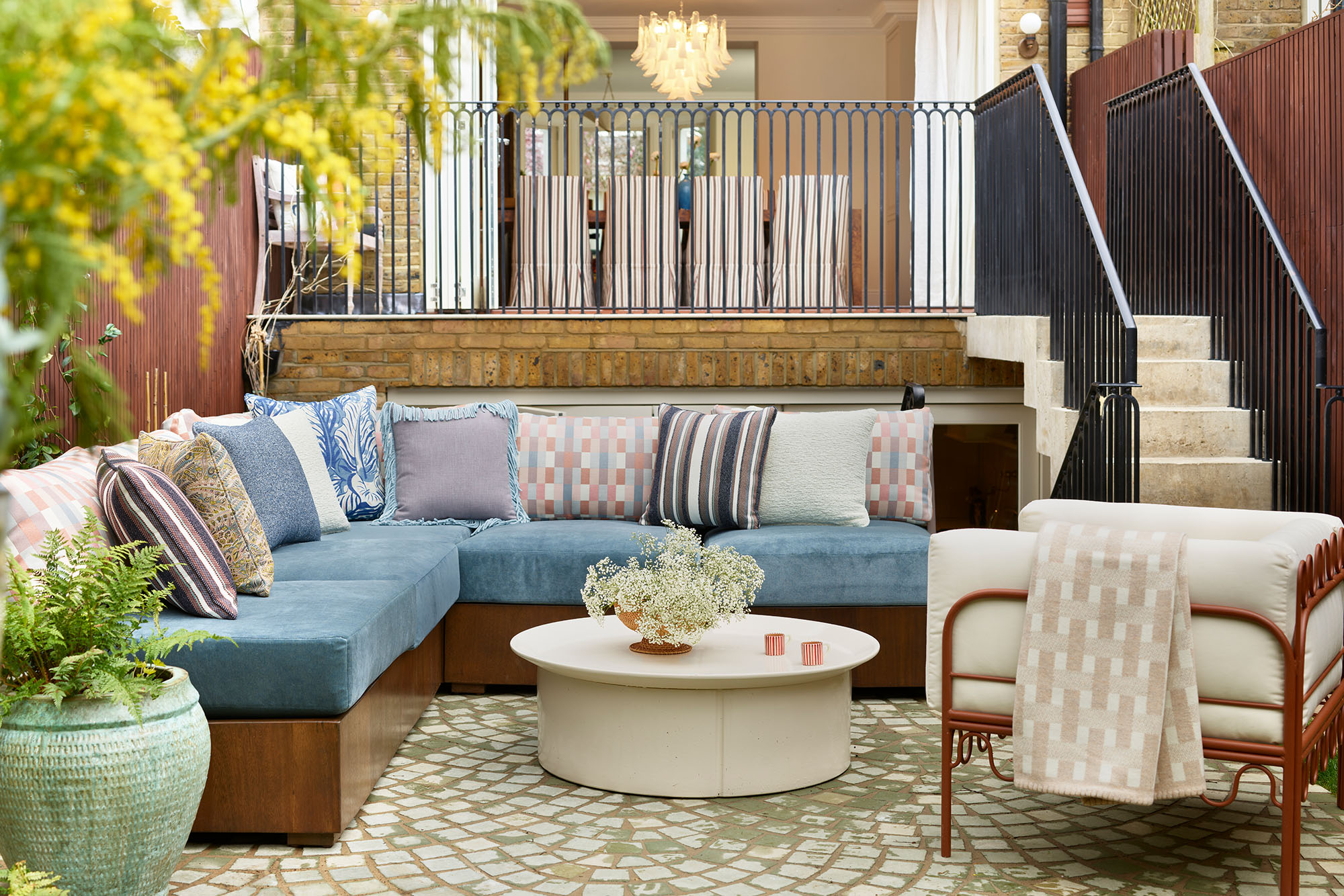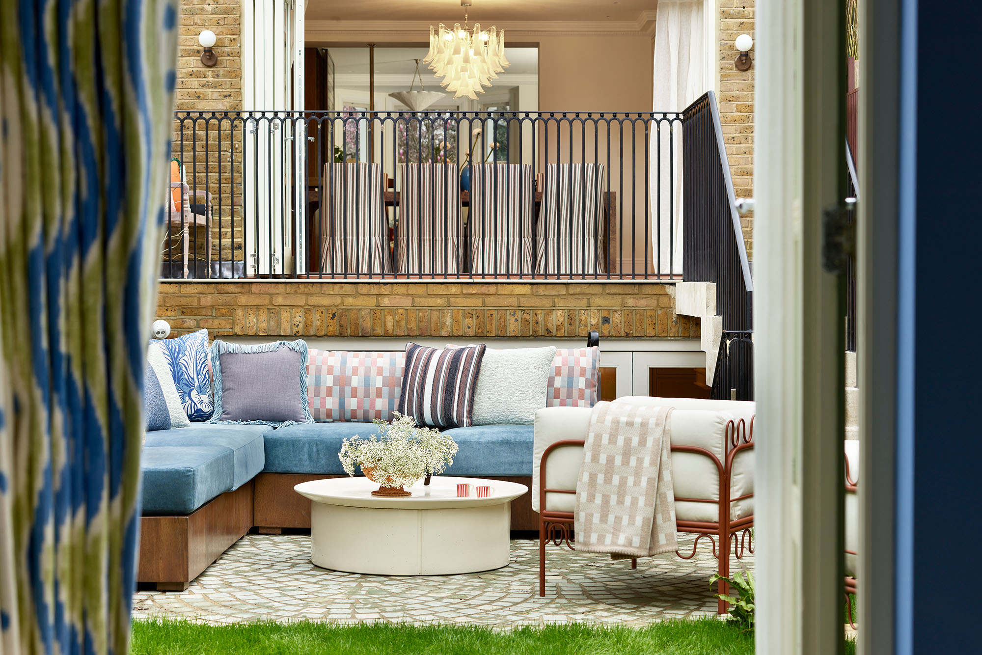 Outside, the garden is divided into three distinct spaces: a terrace with playful striped seating, a lawn with an L-shaped sofa, and a timber guest house with a shower, serving as a flexible home office.