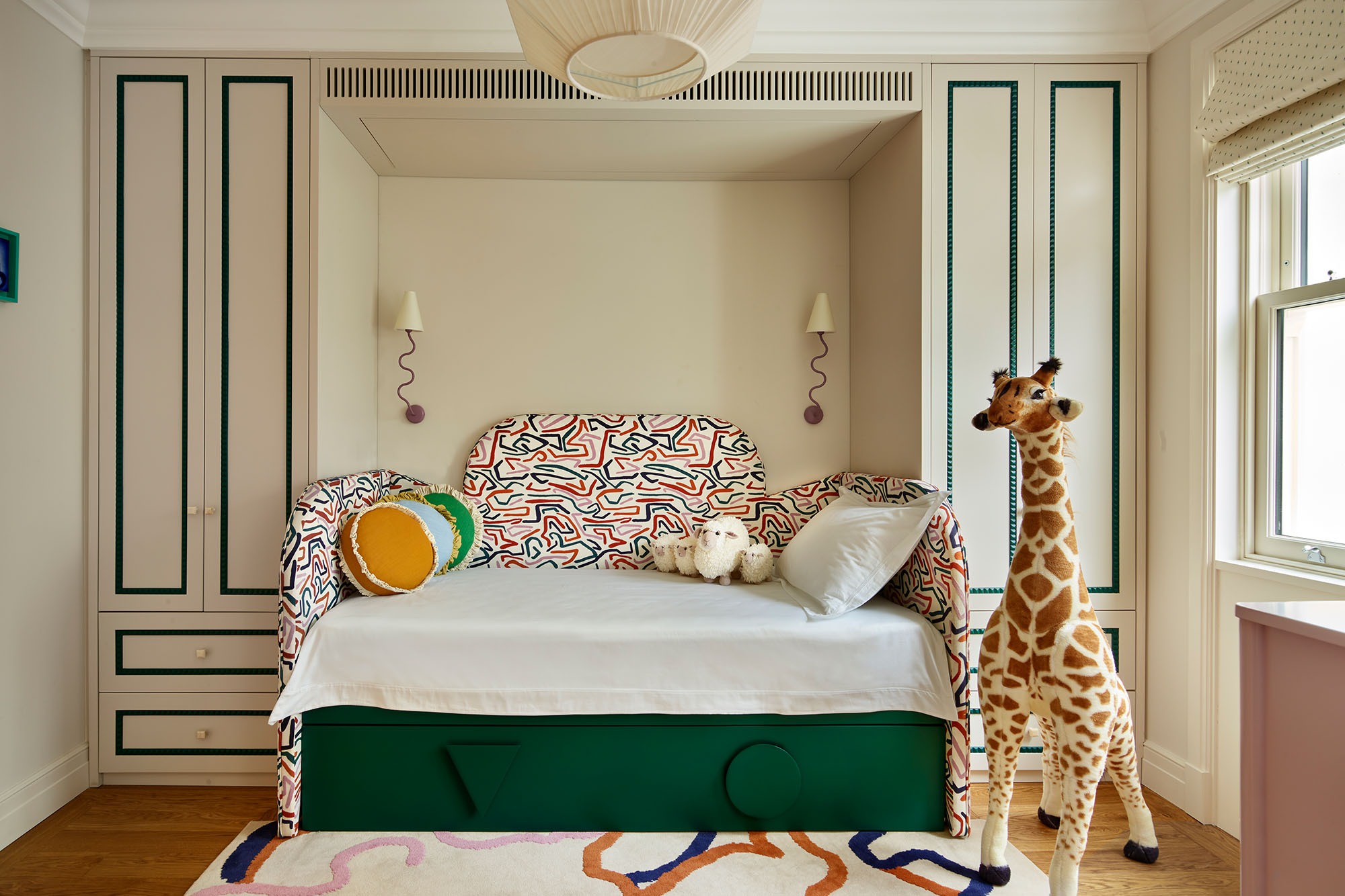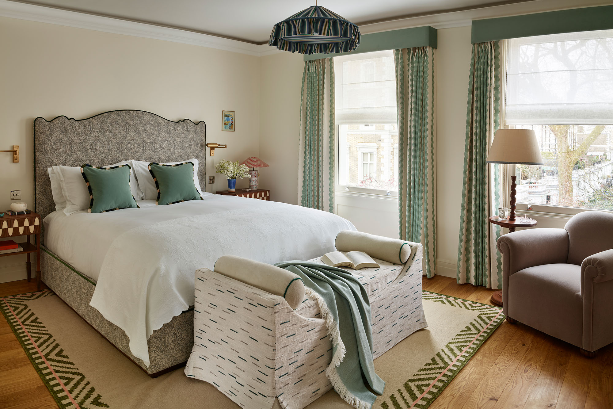 At the top of the house, the principal bedroom extends into a mint-green dressing room with bespoke joinery, and an elegant marble bathroom beyond.